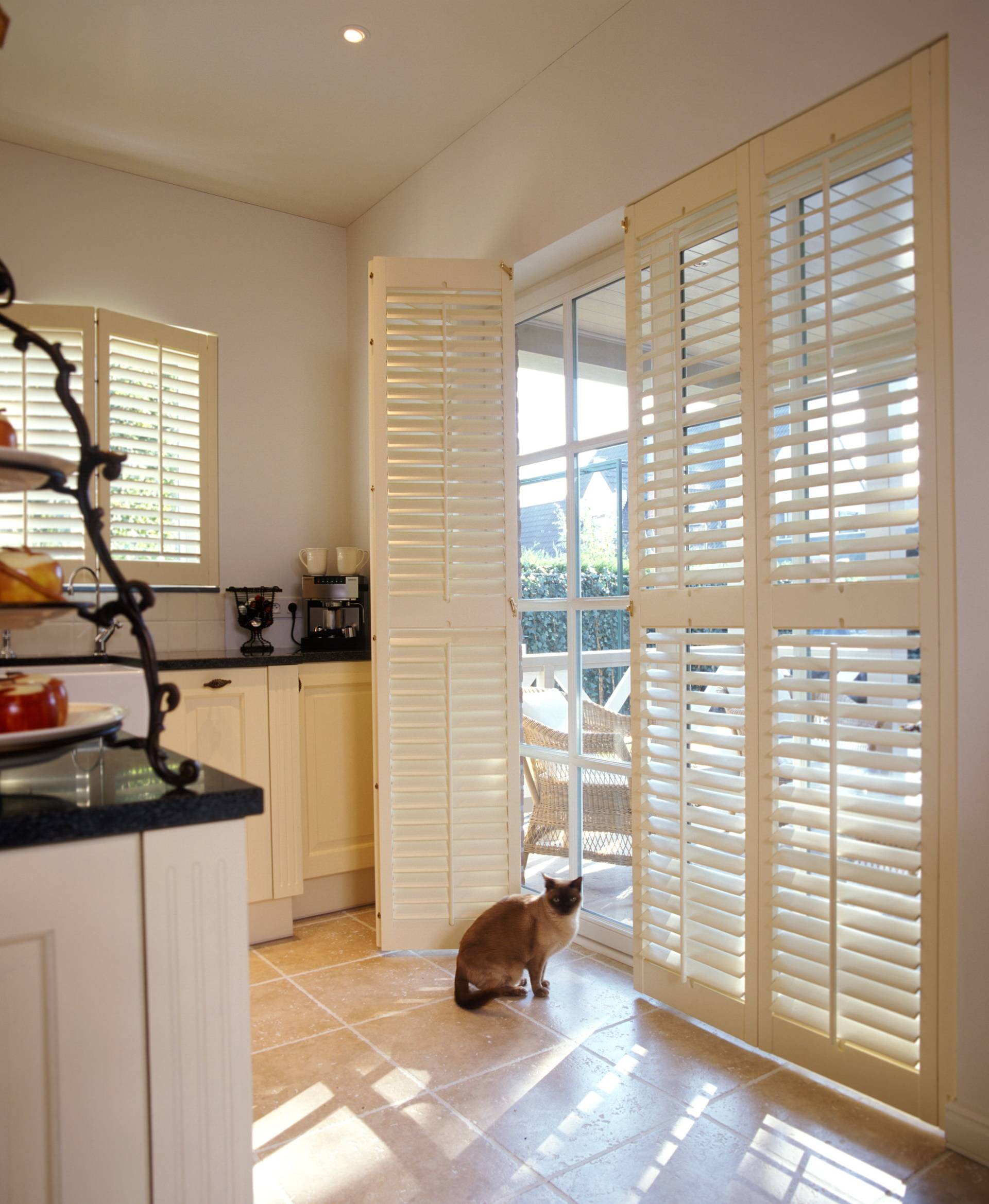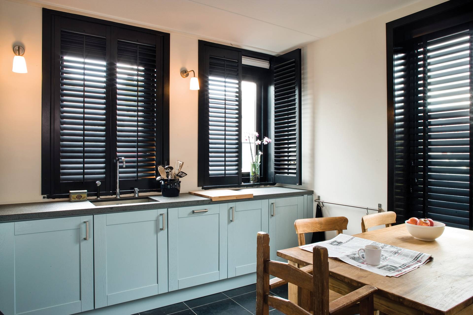 Additionally, we can add shutters to your French doors and windows for complete coverage. We fit shutters to all sorts of spaces, so even if your home has a special shape window, we can help. Our products are available in a vast range of colours and finishes, so you’re sure to find the perfect shutters for your home. Take a look at a few inspirational ideas below for one of the busiest rooms in your home. We even have a kitchen shutter inspiration video to see our ideas in motion.
